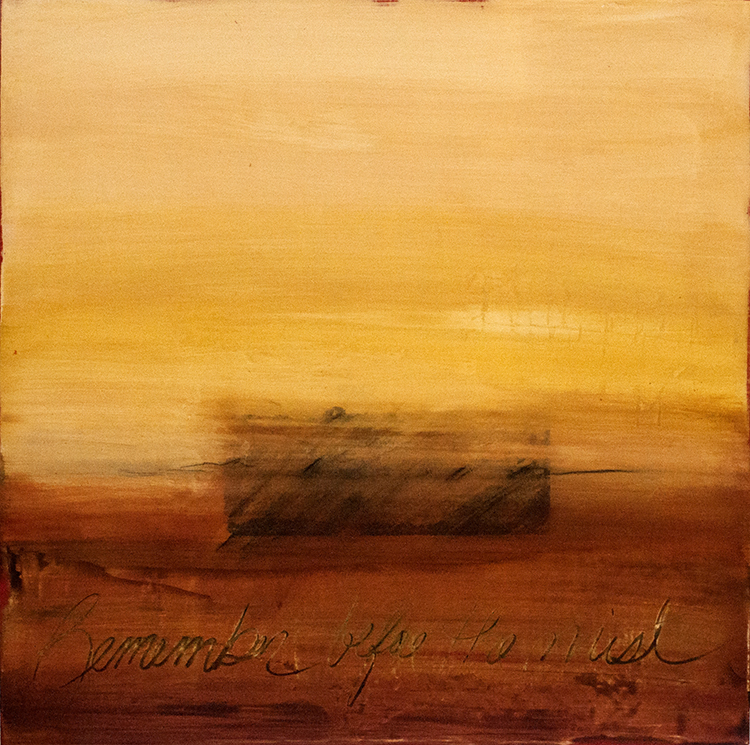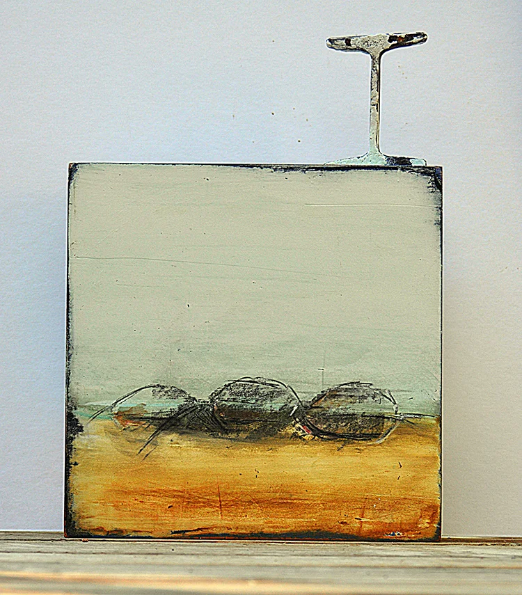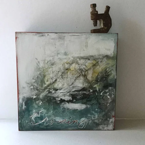 Mixed Media on Panel (acrylic, charcoal, rock, photo)